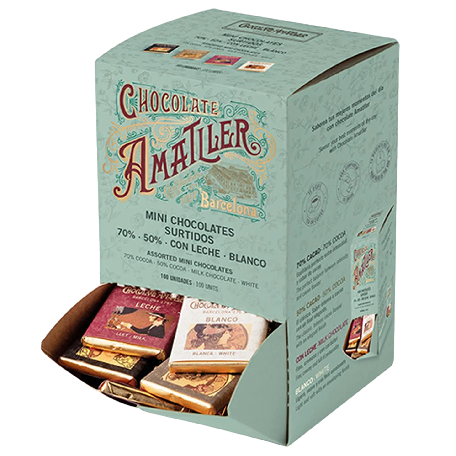 Španělská čokoládovna vznikla již v roce 1797. Bylo to právě Španělsko, kam Hernán Cortéz dovezl první kakaové boby od Aztéků a odkud se čokoláda v 17. století začala šířit do Evropy. Amatller patří mezi nejstarší čokoládovny světa. V roce 1900 navrhl Alfons Mucha pro Amatller soubor plakátů a obalů. Kolekce známých umělců doby se staly evropským hitem, vyhledávaným sběrateli, a i po 100 letech je milují zákazníci po celém světě. Také dům rodiny Amatller v Barceloně patří k vyhledávaným turistickým cílům.